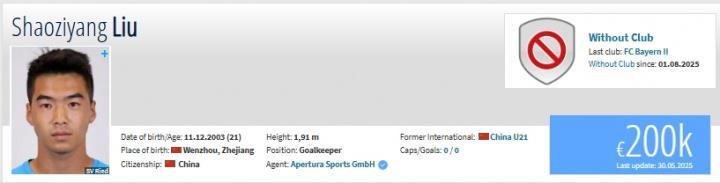 此前德转显示,刘邵子洋自由身离开奥地利乙级球队SV霍恩,“加盟”拜仁二队。
